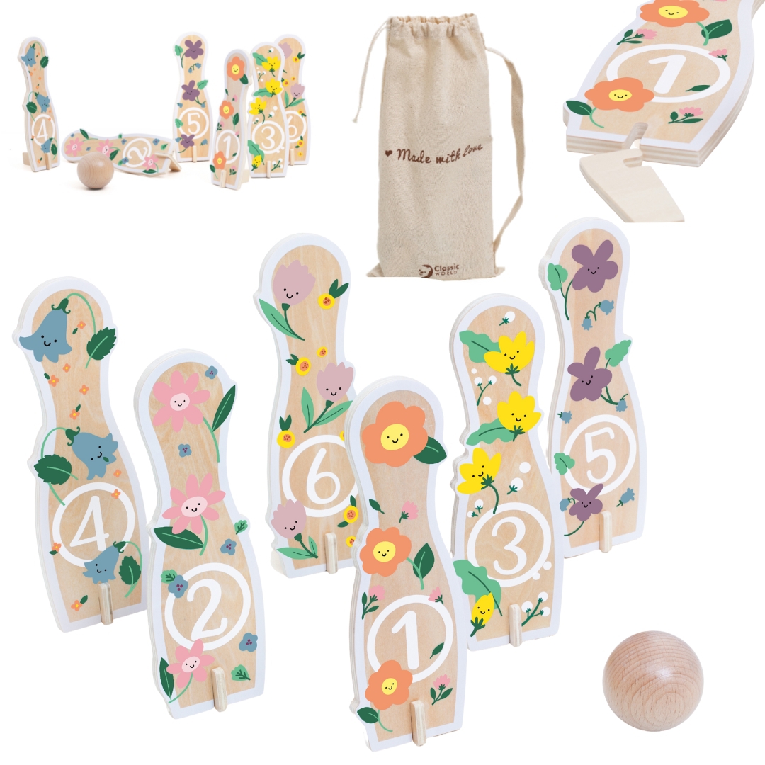 Drewniane Kręgle od CLASSIC WORLD to nie tylko zabawka, ale także narzędzie do rozwijania zdolności ruchowych i umiejętności społecznych u dzieci. Zestaw zawiera 6 kolorowych kręgli z rysunkami kwiatków, 1 piłkę do rzucania oraz worek do przechowywania. Pomalowane nietoksycznymi farbami kręgle są bezpieczne dla maluchów i dodają uroku całej zabawie.